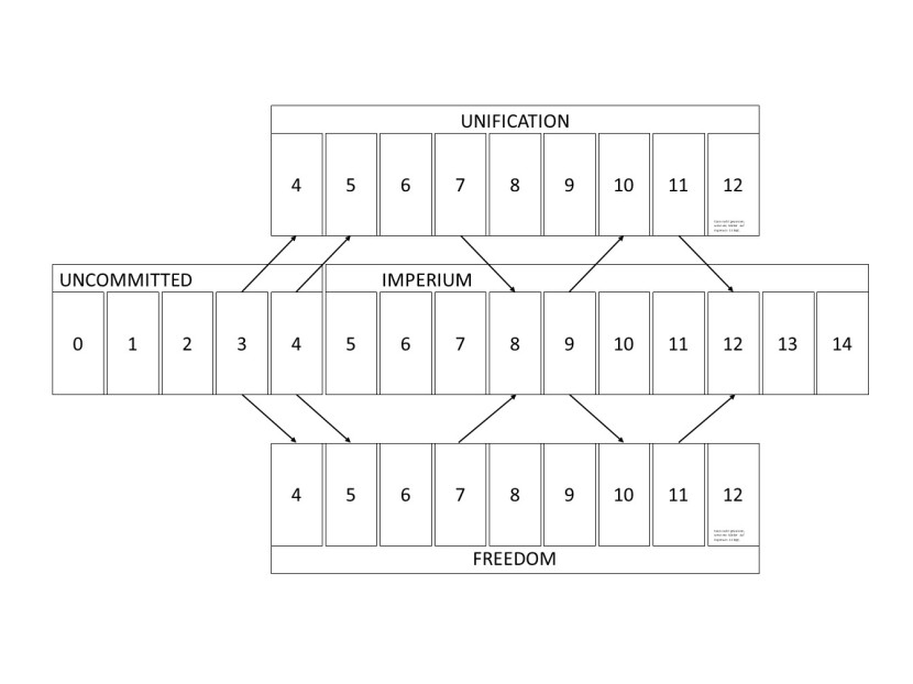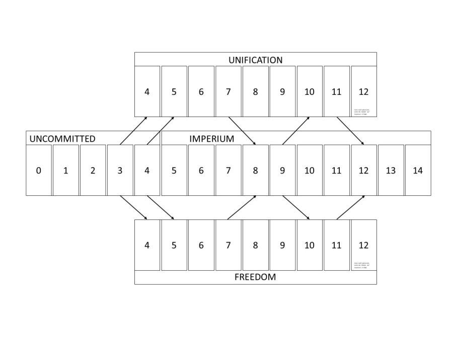 - Unification und Freedom Spieler können das Spiel nicht gewinnen, wenn mindestens ein Imperium-Spieler 13 Siegpunkte hat.